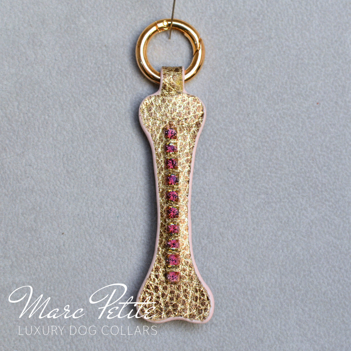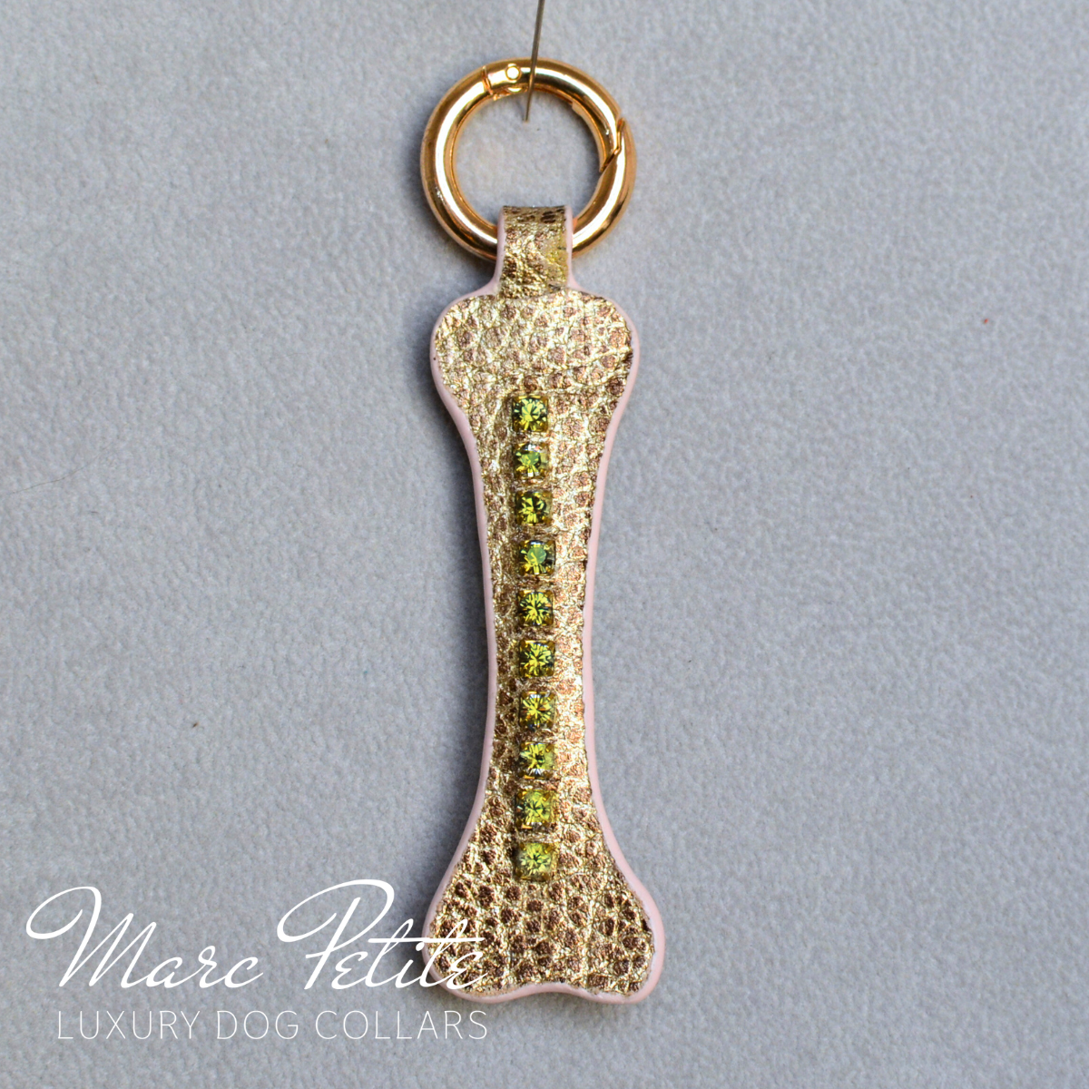 Ajoutez une touche d'éclat à votre amour pour les chiens avec ce luxueux porte-clés fait main en cuir doré éclatant. En forme d'os, cet accessoire est un clin d'œil élégant à nos compagnons à quatre pattes, alliant élégance et espièglerie. Le cuir doré haut de gamme respire la chaleur et la sophistication, tandis que les cristaux Swarovski scintillants rehaussent son charme glamour.
