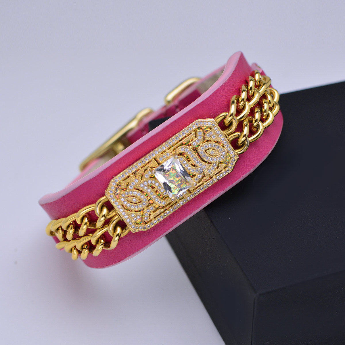 Ce collier pour chien est fait de cuir naturel et orné d'une pièce centrale plaquée or 24 carats avec des cristaux de strass autrichiens CZ et d'une chaîne plaquée or 24 carats. Il est fini avec une boucle et une barrette en laiton de haute qualité avec une charge de rupture élevée.