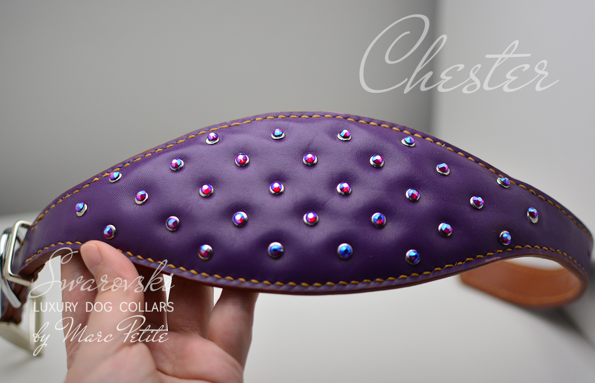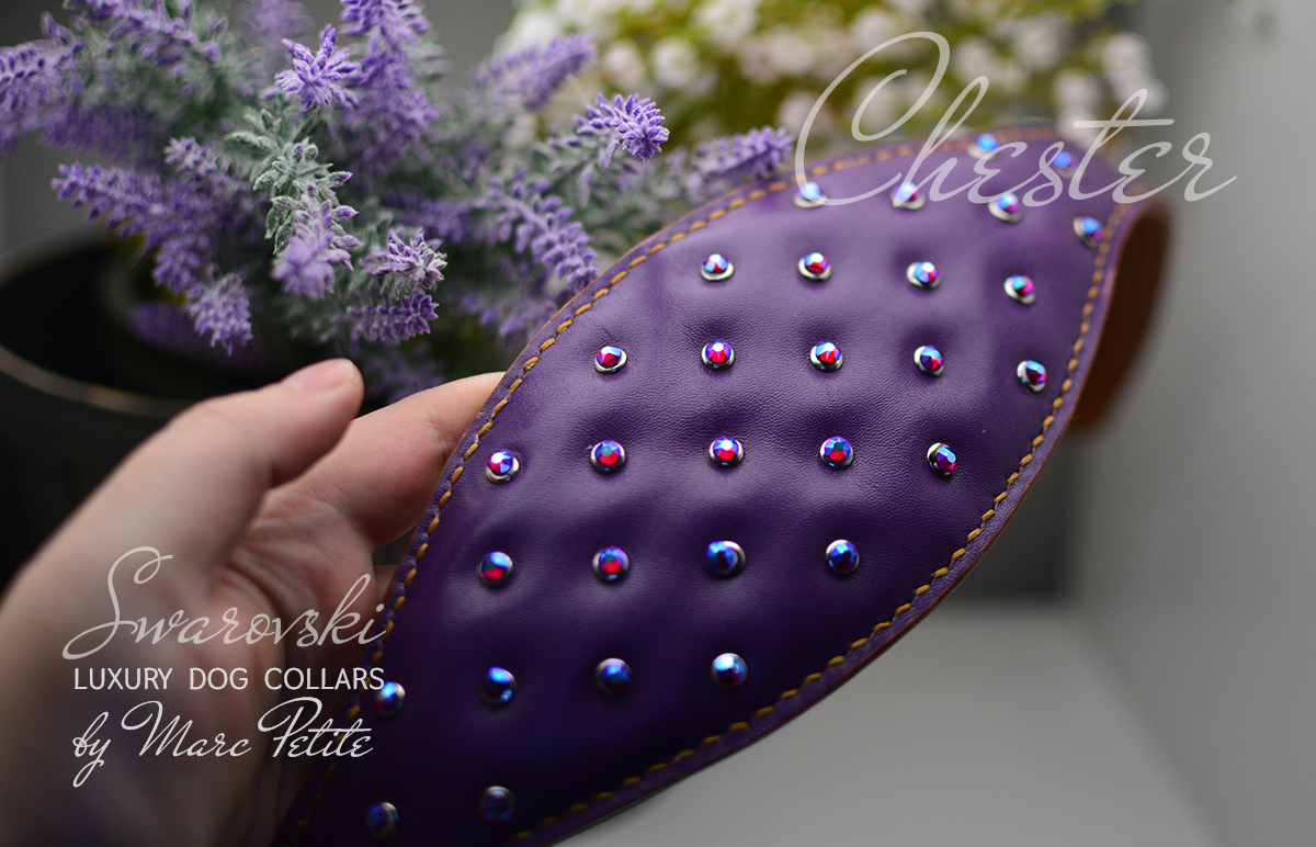 最高級のパープルレザーを使用し、時代を超えたチェスタースタイルでデザインされたラグジュアリードッグカラーで、あなたの愛犬のスタイルをワンランクアップさせましょう。きらめくスワロフスキークリスタルがあしらわれたこのカラーは、エレガンスと耐久性を兼ね備え、最高のものを求めるペットにぴったりのアクセサリーです。