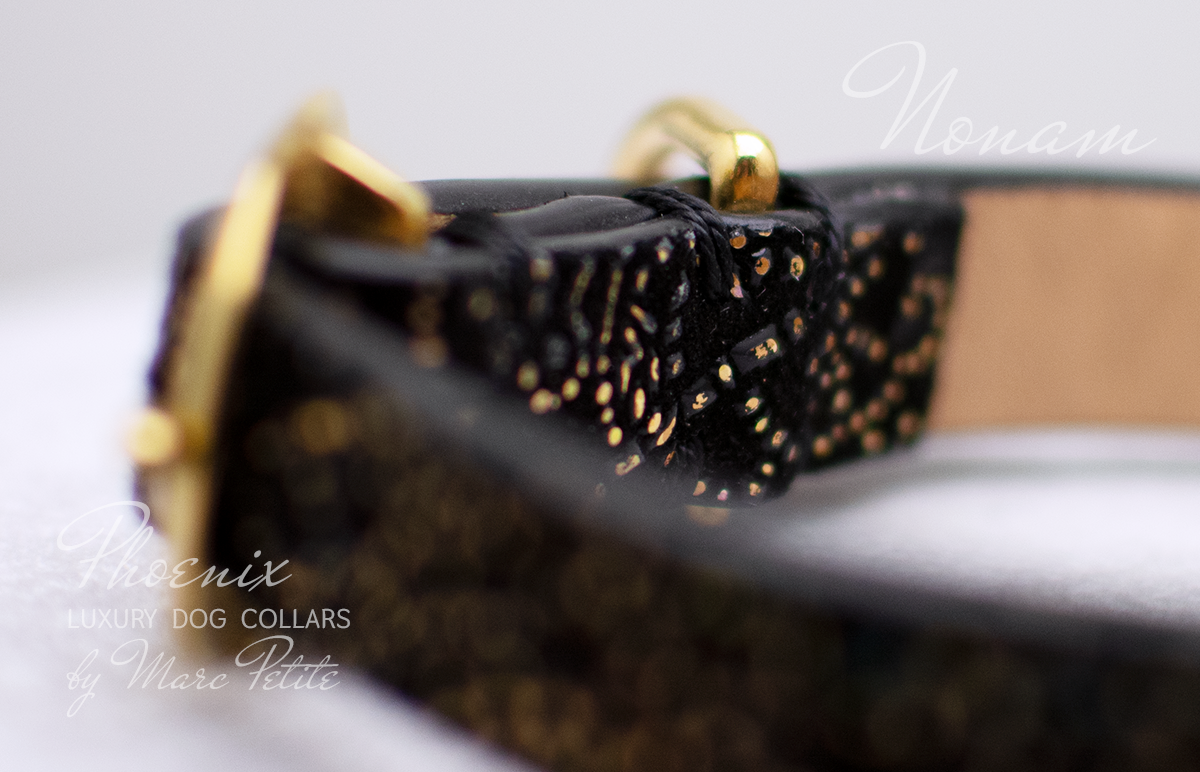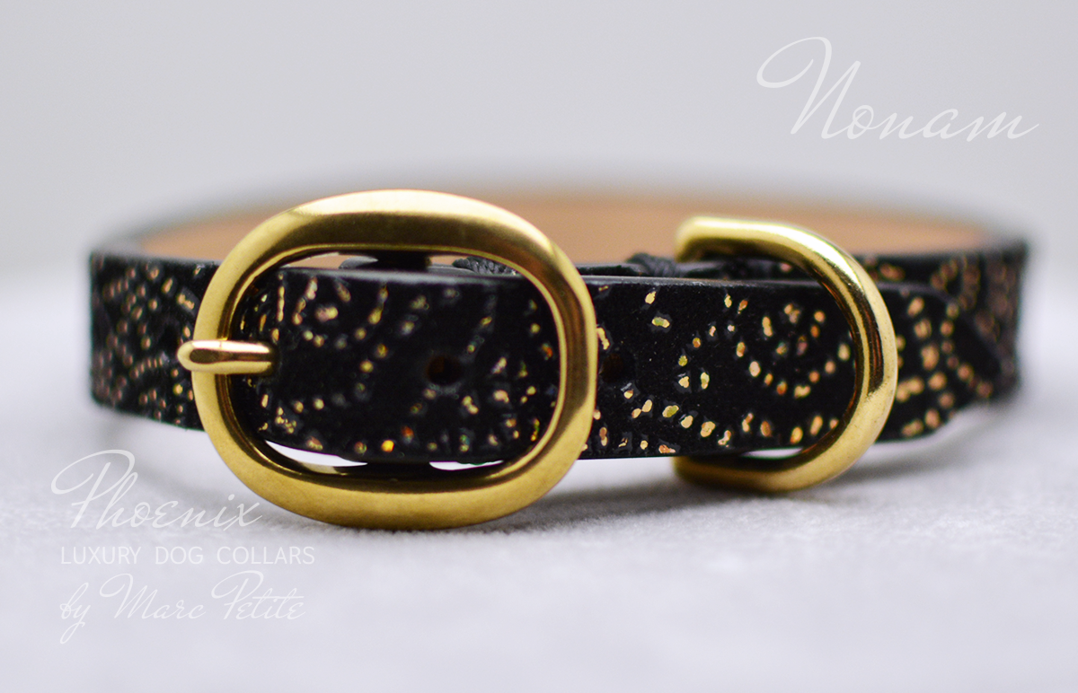 Introducing Nonam, a luxurious and designer dog collar, specially created for all those small and extra-small breeds (toys, cup tea dogs & puppies) that desire a pop of style around their necks. The goatskin leather is embellished with elegant gold designs, and a selection of various styled jewels adorns its length. This piece is not only extremely beautiful but also comfortable and easy to wear. The materials we use are specifically chosen for your dog's comfort.